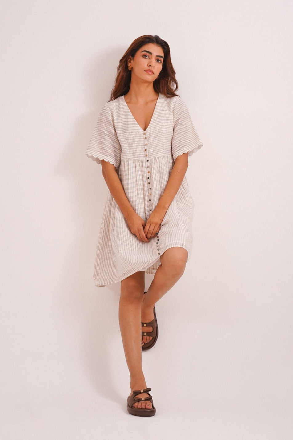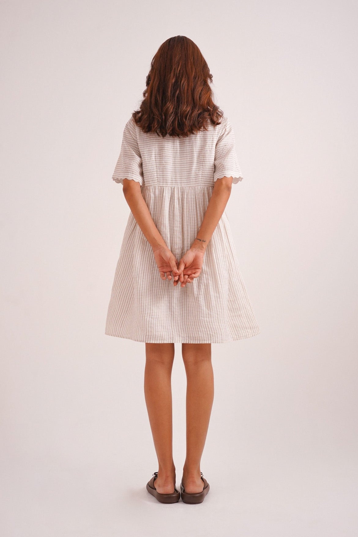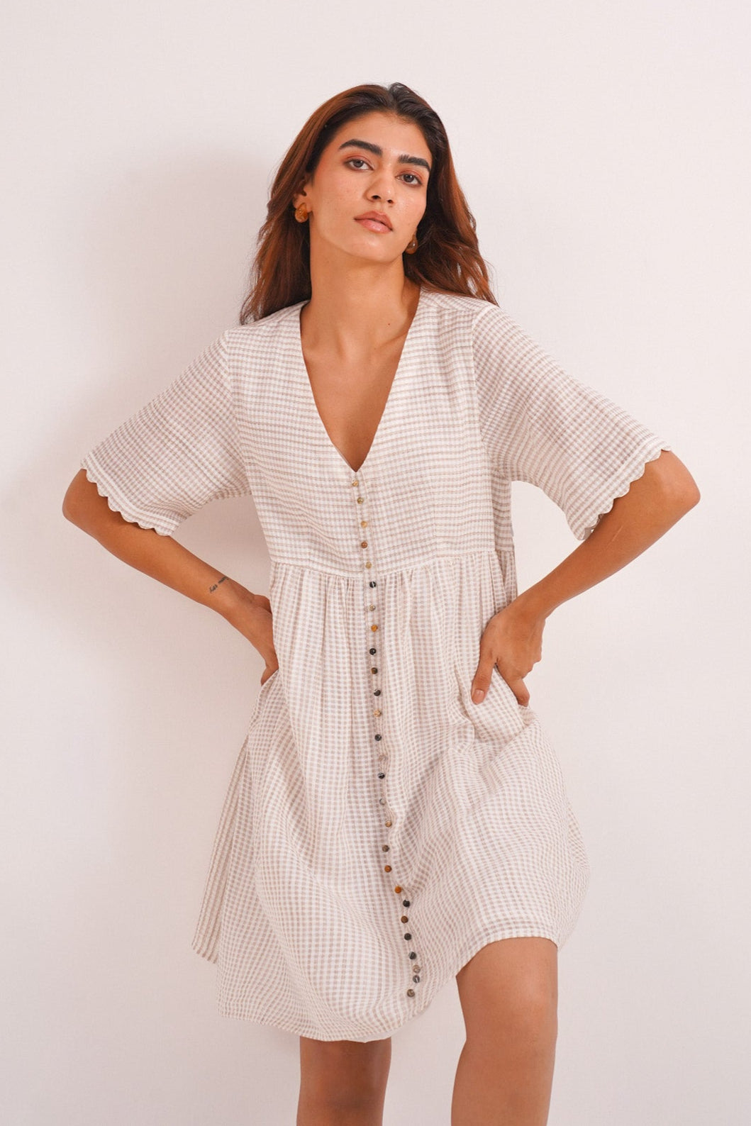 Clay is where simplicity meets soul. Crafted in soft handwoven checks, this short beige dress features scalloped sleeves, an easy empire waistline, and delicate Jaipur bead detailing down the front. With its earthy tone and effortless silhouette, Clay is a quiet celebration of warmth, ease, and understated elegance. Perfect for brunch gatherings, a girls’ day out, or even a soft-statement workday look. It’s made for slow days and sun-drenched moments.