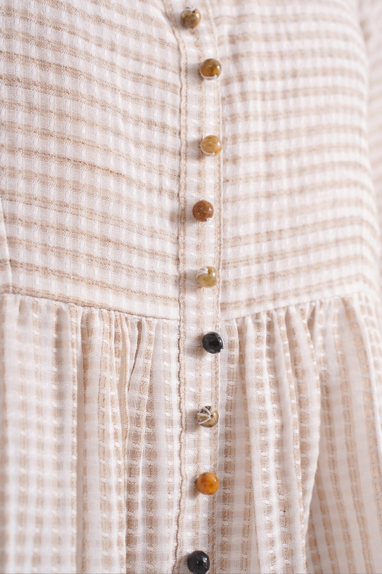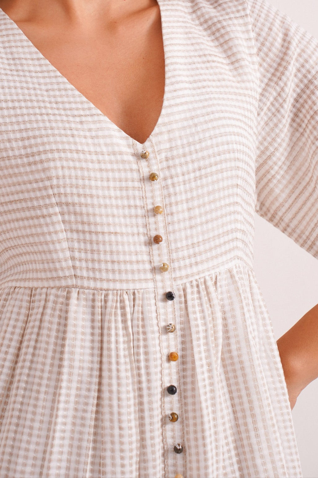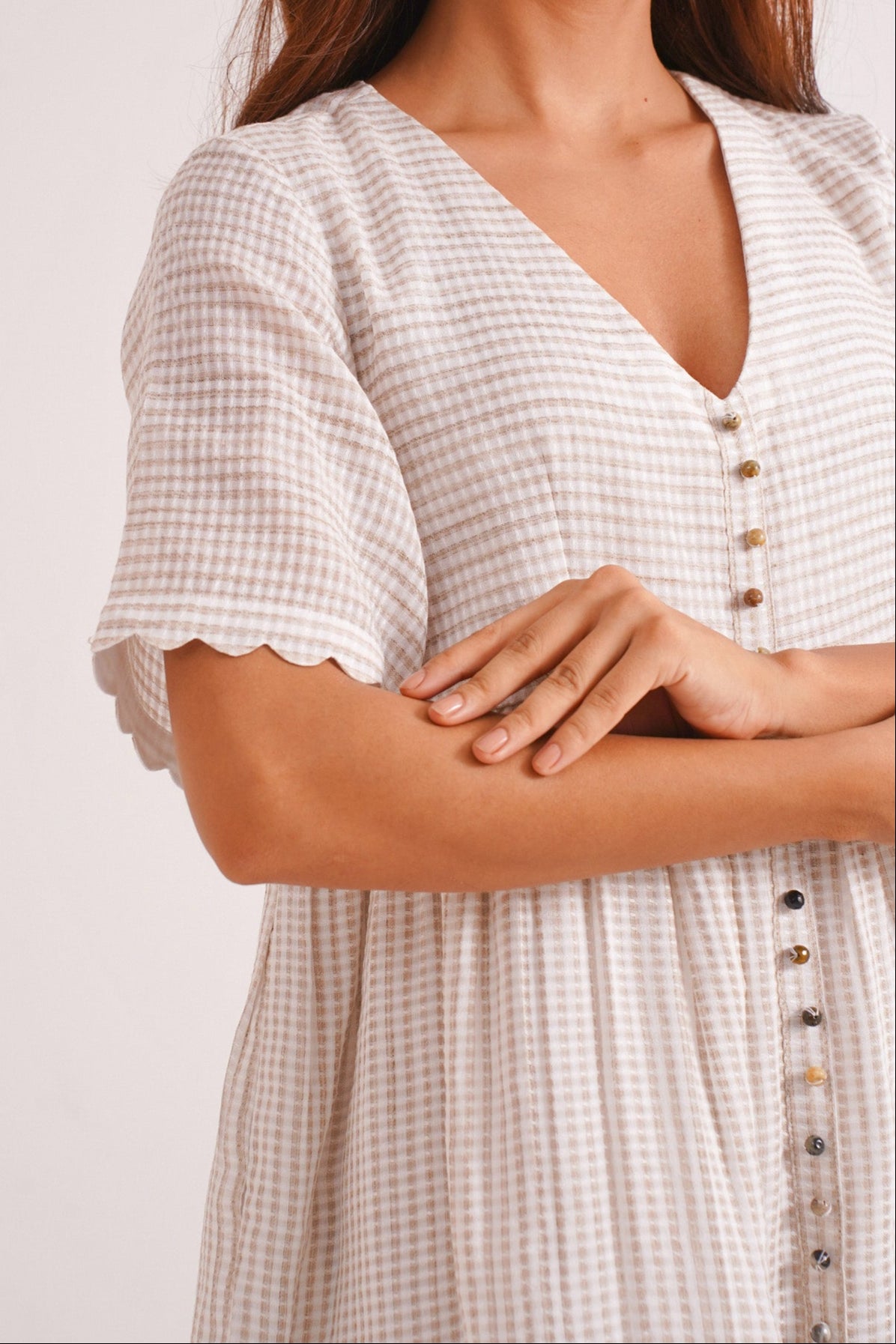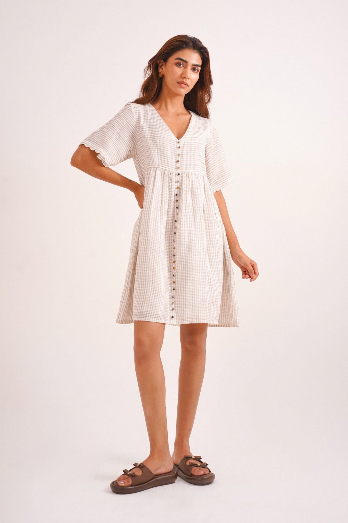 Clay is where simplicity meets soul. Crafted in soft handwoven checks, this short beige dress features scalloped sleeves, an easy empire waistline, and delicate Jaipur bead detailing down the front. With its earthy tone and effortless silhouette, Clay is a quiet celebration of warmth, ease, and understated elegance. Perfect for brunch gatherings, a girls’ day out, or even a soft-statement workday look. It’s made for slow days and sun-drenched moments.